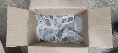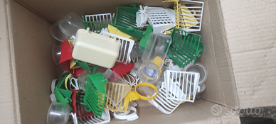 Cedo per cessato allevamento, mangiatoie per voliera, mangiatoie tonde per pastoncini, linguette porta medicinali, pinzette per frutta, ecc. In blocco 100 euro