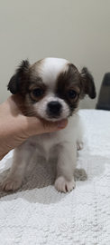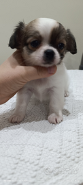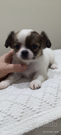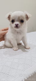 Bellissimi fratellini chihuahua pelo lungo due mesi,uno bianco con piccole macchie bej e uno bianco pezzetto fulvo.genitori visibili di mia proprietà entrambi con pedigree.