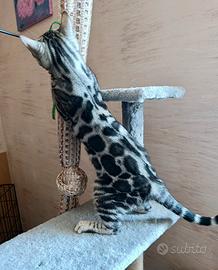 Bellissimo maschietto Bengala di quattro mesi di raro colore Black Spotted Silver, ha altissima qualità, pedigree WCF aperto, testi genetici, vaccinato, sverminato ecc disponibile!!! Ha un pelo molto corto, uno sfondo color puro argento e delle enormi rosette.
