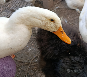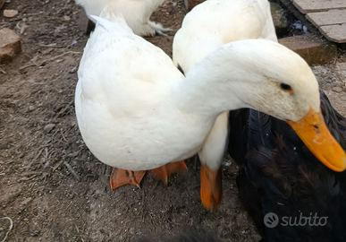 Maschio d'anatra pechinese bianca di sette mesi, cresciuto all' aperto. Disponibile anche marchio di legbar e maschio di marans nero ramato .