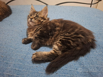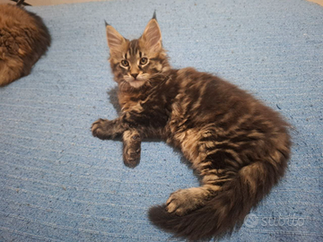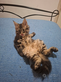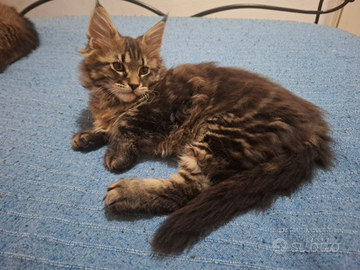 Maschio Maine Coon 2mesi sverminato e vaccinato, controlato da veterinario. Gattino tiene certificato veterinario e libretto. Allegro e curioso, mantello tigrato scuro morbido e setoso. Abituato lettiera. Trova bene con animali domestici. Non perdete occasione trovare amico cuatro zampe.
