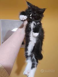 Disponibile Phoenix, magnifico cucciolo di Maine Coon maschio dal mantello bianco e nero Smoke. ULTIMO CUCCIOLO RIMASTO! Nato presso il nostro allevamento Il Castello delle Fusa il 10 febbraio 2026, cresce in ambiente familiare insieme alla mamma e ai fratellini. Il cucciolo verrà ceduto al compimento dei 3 mesi con: Pedigree Anfi Prima vaccinazione Doppia sverminazione Microchip Libretto sanitario Certificato veterinario di buona salute Genitori testati per cardiomiopatia e con ecocardio regolare.