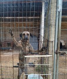 Splendido mantello tigrato scuro; probabile mix Bardino Majorero (cane delle Canarie noto per fedeltà e sensibilità).