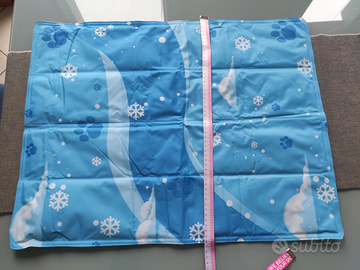 Materassino refrigerante per animali, ideale per mantenere il tuo amico a quattro zampe fresco durante i mesi più caldi. Il design presenta un motivo a tema invernale con nuvole e fiocchi di neve.