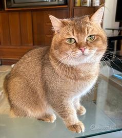 Disponibile uno splendido esemplare di British Shorthair Golden Shaded, dal manto caldo color oro e dagli occhi verdi magnetici. Un vero gioiello tra i gatti di razza, ideale per chi desidera eleganza, affetto e tranquillità.