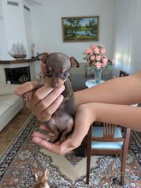 Mini ,, doberman,, Terrier max 1000 grammi Alto come un cavallo arabo, un cane elegante e affettuoso, perfetto per l'ufficio. Addestrabile, obbediente e cammina senza guinzaglio al fianco del suo padrone. Non mangia carte di credito ed è amato da tutti quelli che incontra.Adora i suoi padroni, ama i bambini e non è aggressivo né verso i bambini né verso i passanti.