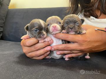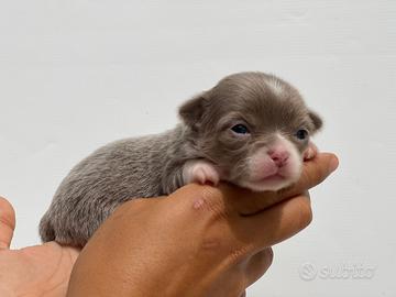 Disponibili da fine aprile dopo il compimento dei due mesi stupendi cuccioli di chihuahua pelo lungo bianchi e lilac, bianchi e blue e cioccolato. Hanno gli occhi chiari che resteranno chiari anche da adulti. Sono molto tipici come testa e muso e di taglia minuta. Sono nati e cresciuti in casa, saranno socializzati e abituati ai tappetini igienici. Verranno consegnati sverminati, vaccinati, con test feci che ne attesta la salute, prima visita veterinaria, microchip e pedigree.