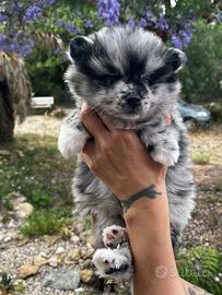 Ultima femmina disponibile pomsky miniatura f5 color blue merlè . La mamma pesa 7,5 kg e il padre 4 kg , resterà molto piccola ed è un vero spettacolo dagli occhi azzurri .