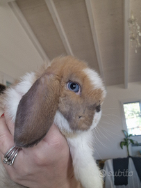 Vendo a rimborso spese minilop femmina di 2 mesi e mezzo. Presa da un allevamento ha il libretto sanitario con vaccino annuale già fatto (50€) colorazione Madagascar split occhi azzurri. La coniglietta è molto affettuosa e dolce, abituata alla lettiera e super brava. La cedo perché purtroppo incompatibile con l'altro mio coniglietto.