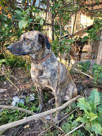 Splendido mantello tigrato scuro; probabile mix Bardino Majorero (cane delle Canarie noto per fedeltà e sensibilità).