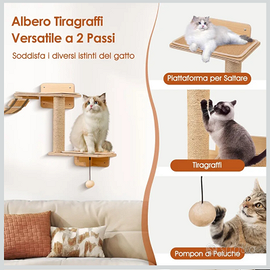 Mobile per Gatti da Parete con Accogliente Amaca, 2 Pali Tiragraffi, 2 Piattaforme, Ponte, 3 Tappetini e Pompon Appeso, Tiragraffi da Parete per Gatti con Forme Simpatiche per Soggiorno