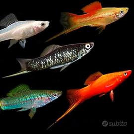 Vendo mix di mollie e swordtail (Xiphophorus hellerii) in gruppi di almeno 6 per 2 euro al pezzo (per pesce). Solo ritiro in Altavilla Milicia. Sono pressi a random dal nostro laghetto. Ci sono di tutti colori come rosso, nero, bianco, marrone, arancione etc. Ci sono anche dei mollie balloon.