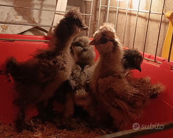 Disponibili da subito 9 pulcinotti di moroseta di circa 2 mesi nei colori nero, cioccolato e perniciato, nati da cova naturale quindi abituati all' esterno e chiusi in pollaio di notte.