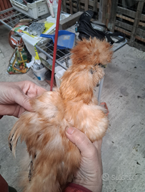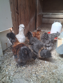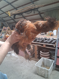 Vendesi n° 4 galletti di moroseta di circa 3 mesi, molto belli e colorati, sono cresciuti in casa, quindi molto docili, possibilità di venderli in coppia con gallina della stessa età. Al momento non si vendono galline singole. Rimangono: 1 galletto bianco 1 galletto nero con collare rosso 1 galletto rosso e nero 1 galletto nero con schiena rossa. La gallina è a scelta fra le rimaste. Ci troviamo in provincia di Ravenna. Prezzo del gallo singolo 20 ? Prezzo della coppia 50?