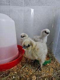 Abbiamo disponibile adesso 4 pulcini di razza Moroseta "Splash", sono nati 27-28 Dicembre. 10 euro l'uno, se ne prendi di più il prezzo può essere abbassato.