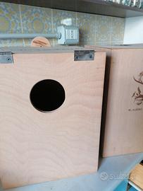 Nidi x pappagalli costruite con multistrato di faggio cm. 24x24x altezza 31. Possibile foro a dx o sx con diametro varie misure. A richiesta è possibile personalizzare, con logo o testo, il lato frontale della cova con incisione laser... Costo ? 4.00 per ogni incisione. Prezzo in base alla quantità. Indicativamente per 10 pezzi costo unitario 20. Per quantità inferiore chiedere preventivo.