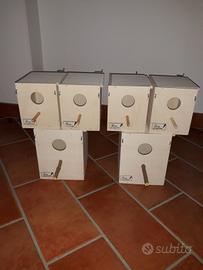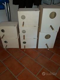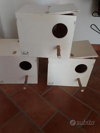 Nidi per bengalini e passeri del Giappone euro 6, misure 14x12,5x12,5 con frontalino rimovibile Bengalini euro 6,5 13x14 slt 15 spess 8 Cocorite euro 7,5 15x16 alt 18.5 spess. 8 Inseparabili euro 9.5, 25x17 alt 18.5 spess. 8 Calopsite euro 18, 25x25 alt 30 spess. 10 Kakarichi euro 20 25x25 alt 30 con apertura sul tetto e su un lato, e striscia di rete per arrampicarsi spess. 10. A richiesta con nicchia sul fondo, tutti apribili, possibilità di avere ad apertura scorrevole, con maggiorazione sul prezzo di euro 0.50 zona cittadella posso spedire. cell.3393972846. Per soddisfare al meglio le esigenze del cliente i nidi vengono costituiti al momento della richiesta.