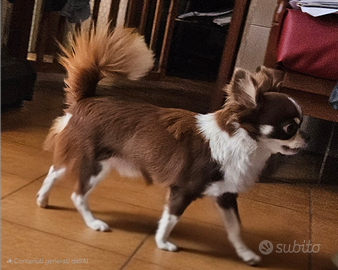 Cercasi femmina per accoppiamento per il mio splendido chihuahua a pelo lungo, Yuki. È di colore bianco cioccolato, ha un anno e ha già esperienza. Ha un'indole dolce e affettuosa, pesa circa 2,5 kg ed è un cane equilibrato e sano. Se pensi che la tua cagnolina sia la compagna ideale, contattami!