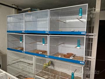 cedo il mio allevamento di ondulati inglesi formato da 7 soggetti bellissimi da esposizione con 3 coppie garantite e altri 27 novelli del 2025 - 8 gabbie nuove da cova 60x40x40 - 8 nidi per ondulati gabbie terenziani 90x40x40 - centralina alba tramonto FRAN PET le gabbie da cova sono nuove con frontalino creato per ondulati € 80 l'una le terenziani € 85 l'una e la centralina € 150