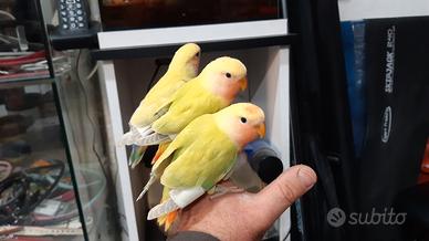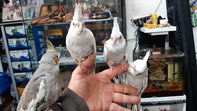 Pappagalli allevati a mano o allo stecco. Disponibili anche altre razze oltre a callopsitte e inseparabili presenti nelle foto, come cocorite e parrocchetti, e possibile anche su richiesta di specie più particolari e ricercate. Vasta disponibilità anche di gabbie di diverse dimensioni e tipologie e tutto l'occorrente per il mantenimento dei vostri compagni. Ovviamente il prezzo cambia a seconda di razza e/o colorazione dell'esemplare.