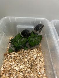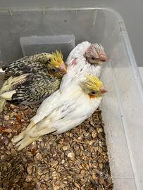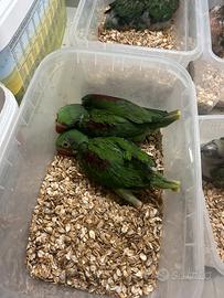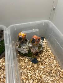 Pappagalli baby allevati a mano, in fase di svezzamento. Conuro del sole, ecletto, calopsite, cacatua rosa, lorichetto e grande alessandrino