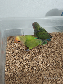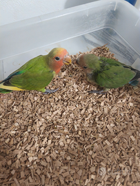Pappagalli inseparabili allevati a mano in fase di svezzamento cioè che stanno per iniziare a mangiare da soli,gli inseparabili hanno iniziato a fare i primi voli