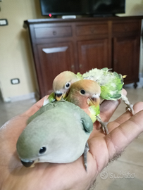 Disponibile a fine svezzamento calopsite inseparabili allevati a mano con addestramento di richiamo su prenotazione di varie mutazione. Per info contattatemi al numero 3286298633.