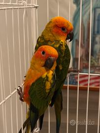Vendo coppia maschio e femmina di pappagalli Conuri del Sole "parlanti" allevati a mano compresa voliera, nati agosto 2025