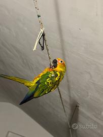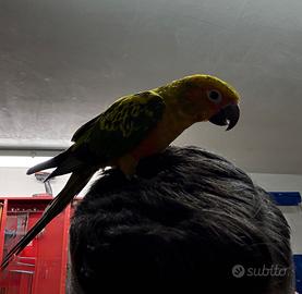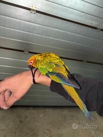 Vendo pappagallo conuro del sole , allevato a mano . Nato il 5/6/2025 , abituato a stare fuori dalla gabbia in ambiente chiuso . Dotato di documento CITES .