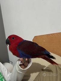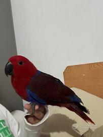 Vendo il pappagallo ecletto di 7mesi e mezza perché devo andare nel mio paese e domestico 100% ha appena lasciato a mangiare con la siringa e adesso ha imparato mangiare da sola è una bella femmina sono a Bergamo in centro vicino alla stazione il prezzo è di 1,400€