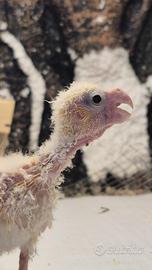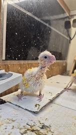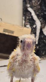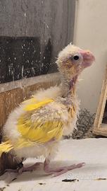 Cresciuto con cura, ben nutrito e seguito quotidianamente. Attualmente in fase di crescita, con piumaggio in sviluppo e colori gialli ben visibili.