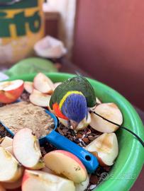 Vendo splendido lori arcobaleno di due mesi allevato a mano fin dai primi giorni e buonissimo con tutti anche con persone che non conosce, si nutre principalmente di nettare e frutta fresca é nato nel mio allevamento. Il pappagallo dispone di anello Foi inamovibile e cites. Per qualsiasi info contattatemi possibilmente gente seria e che se ne sappia prendere cura nei migliori dei modi. Mi trovo a Licata provincia di Agrigento