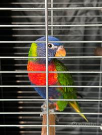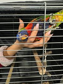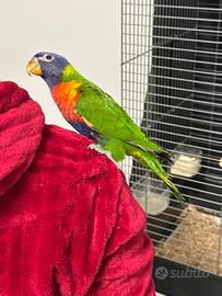 Vendo esemplare di pappagallo tropicale Lorichetto Arcobaleno (Trichoglossus haematodus)di 4 mesi, allevato a mano . Vivace, tenero, abituato al contatto umano, sta sulla spalla, gioca e può essere addestrato a ripetere parole. Comprensivo di documentazione Cites. La gabbia e' a parte, nel caso vogliate la gabbia spaziosa con accessori, questa e' praticamente nuova .Il prezzo comprensivo di gabbia e pappagallo e' di 350 euro. 250 euro invece il solo pappagallo. Possibilità di ritiro zona orientale di Salerno. Per altro info, scrivete un messaggio. Grazie