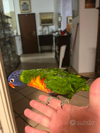 Privato vendo pappagallo Trighoglossus Molluccanus nata a giugno 2024 con regolari documenti, pagato 250 euro (vendo pure apparte gabbia su ruote e piedistallo in legno euro 85 )