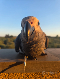 Cenerino (Psittacus erithacus) allevato con attenzione quotidiana. È un soggetto equilibrato, vivace e abituato alla presenza umana, con piumaggio compatto, colori uniformi e ottima postura. Cresciuto in ambiente pulito e stimolante, mostra un carattere collaborativo e molto interattivo.