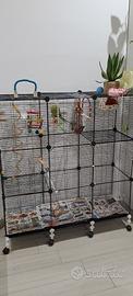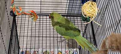 Per causa spostamenti frequenti di lavoro vendo parrocchietto 8 mesi comprato a fine Ottobre il pappagallo e fiducioso con la famiglia e esce anche fuori dalla gabbia per poi rientrare da solo... ha iniziato a fare versi nuovi e sta imparando a parlare. Si vende con gabbia che si può modellare come si vuole a 3 aperture che si possono sempre mettere dove si vuole, la gabbia voliera si può fare di qualsiasi altezza o dimensione questa in foto è la più grande 1.20x1.10 ha un sacco di spazio per muoversi ... facile da pulire e da spostare grazie alle ruote... si vende completa di giochi e accessori cibo. Contattare solo se interessati