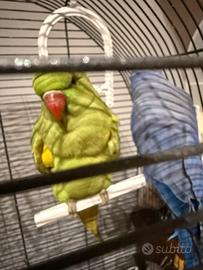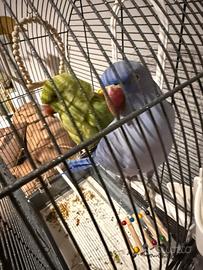 Una coppia di parrocchetti dal collare, allevati a mano, molto affiatata. Lui è viola, piumaggio meraviglioso, e più affettuoso. Lei verde, molto docile. Entrambi anni circa un anno. Già svezzati e con sessaggio. Sono spaventati dalle mani umane, però vanno su tutto il corpo. Sicuramente si riprodurranno in primavera. Purtroppo non posso più tenerli. Prezzo trattabile.