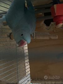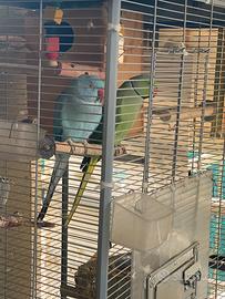 Coppia riproduttiva parrocchetti dal collare femmina blu e maschio verde con voliera grande compresa di giochi e gabbiotto in legno per riproduzione, al momento hanno anche 5 uova