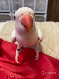 Cerco una casa privata (no allevamenti, no riproduzione) per parrocchetto dal collare albino, allevato a mano.