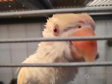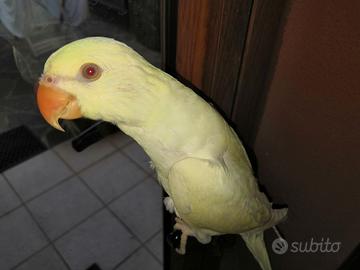 Vendo Parrocchetto dal Collare "Cremino" - Parla ed è Allevata a Mano Mutazione rara Cedo splendida femmina di Parrocchetto dal Collare (Psittacula krameri) di 7 anni, mutazione Cremino (un elegante bianco crema con occhi rossi). Allevata a mano: Estremamente docile, abituata al contatto fisico e a stare in libertà in casa. Parla dice qualche parola Mutazione Cremino: Colore raro e molto raffinato, piumaggio in condizioni impeccabili. esemplare maturo equilibrato e nel pieno della sua vitalità pronta alla cova L'animale è in ottima salute, segue una dieta varia e bilanciata. È un compagno ideale per chi cerca un pappagallo socievole, intelligente e già "educato" alla convivenza umana