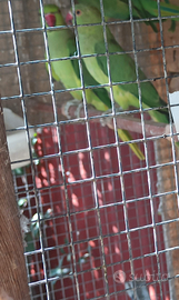 Coppia pappagallo parrocchetto dai bellissimi colori verde giallo lunga coda allevati in gabbia ora in voliera. Euro 100 tutti e due