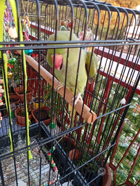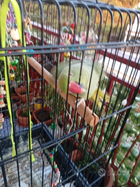 Simpatico parrocchetto dal collare con la sua grande gabbia