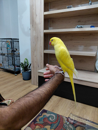 Vendo pappagallo Ringneck giallo di 18 mesi. È femmina, addomesticata a mano e abituata al contatto con le persone. Non parla, ma sa fare 2-3 tipi di fischi diversi. Mangia semi di girasole e frutta. È abituata a stare fuori dalla gabbia, ma non a volare libero, e non ha mai vissuto con altri animali. Include una gabbia piccola. Zona Guastalla. Motivo della vendita: personale per tutte le informazioni chiamare questo numero 329 1538157
