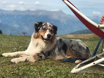 Ciao sono Leo un Pastore australiano blue merle, red factor con pedigree. Ottima stazza e corporatura, peso circa 30kg. Anche e gomiti perfetti e tutti test genetici effettuati ed apposto. Ottimo carattere molto docile, va d'accordo con persone, bambini e tutti i cani sia maschi che femmine. In giardino da solo, grazie al suo buon carattere, non abbaia prarticamente mai.
