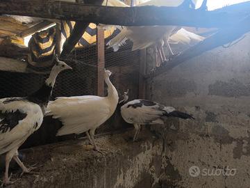 Cedo coppie di pavoni bianchi. Animali in perfetta salute, nati da cova naturale ed allevati a terra. Gli animali hanno un anno. Si cedono SOLO in coppia (NO femmine singole). Possibilità anche di formare coppie con maschio bianco e femmina arlecchino. Prezzo indicativo per coppia, non trattabile.