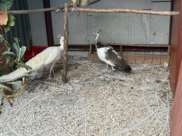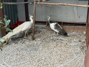 Vendo coppia di pavoni di 3 anni, maschio bianco e femmina arlecchino, prezzo 300 euro. Contatto tramite email