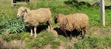 vendo le 2 pecore in foto. la bianca ha 2 anni a maggio, la marrone ha 3 anni e ha una ferita ad un occhio da cui vede solo in parte. per entrambe chiedo 350€ sono registrate, non sono da macello sono sverminate e vaccinate. si vendono solo insieme a chi le tratterà bene.