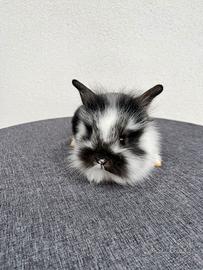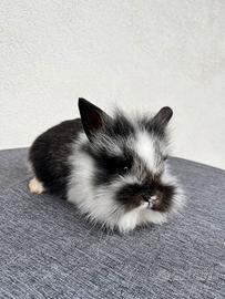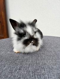 Pepe è un cucciolo di coniglio testa di leone maschio, dal pelo lungo bianco e nero pezzato e dal carattere dolce e socievole. Perfetto per chi cerca un piccolo compagno tranquillo e affettuoso, ideale per portare allegria e compagnia in casa.