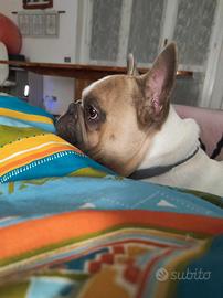 Ciao mi chiamo Rio. Sono un bulldog francese anuro, tricolore diluito (grigio, bianco, sabbia) con predominante cromatica bianca. Papà e Mamma sono grigi e da loro ho preso gli occhietti blu, ora color ambra.