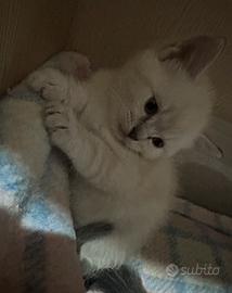 Bianco muso leggermente schiacciato pelo lungo orecchie musetto e coda grigia occhi azzurri maschio